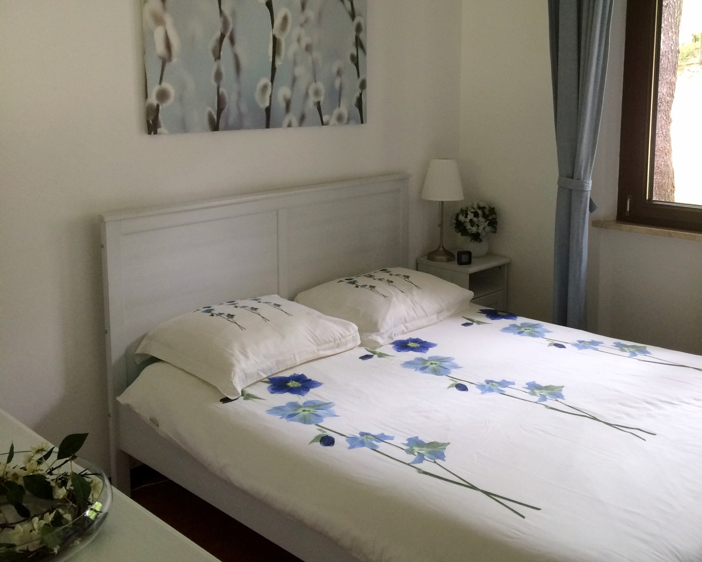 Vanaf de veranda heb je een prachtig uitzicht over het heuvellandschap, met aan de ene kant de zee en aan de andere kant de bergen. Het is een heerlijke plek om te ontbijten in het ochtendzonnetje, ’s middags te lunchen in de schaduw of om ’s avonds een boek te lezen. Ga je op ontdekkingstocht door de tuin dan kom je vele mooie bloemen en planten tegen. Pluk naar gelang het jaargetijde kersen, abrikozen, peren of vijgen uit de fruitbomen.